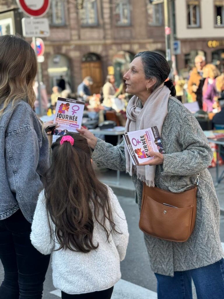 Notre démarche s’est voulue à la fois pédagogique et participative, avec la distribution d’un tract détaillé présentant des actions concrètes, réalistes et immédiatement applicables pour améliorer et faciliter la vie quotidienne des femmes strasbourgeoises. Cette action de terrain nous a permis d’échanger directement avec les habitantes et d’apprécier leurs retours.