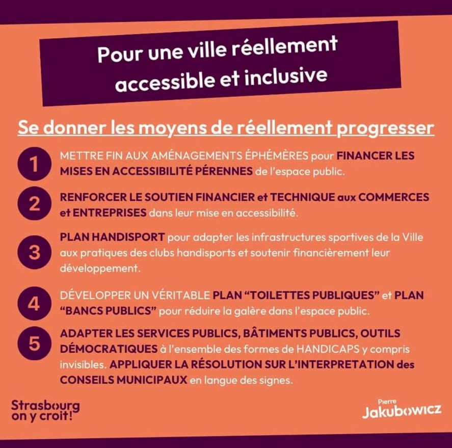 Pour faire de Strasbourg “une ville réellement accessible et inclusive”, je propose cinq axes d’action :