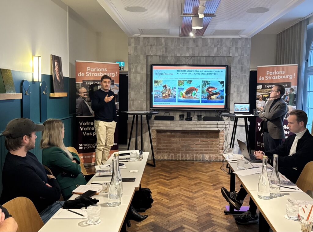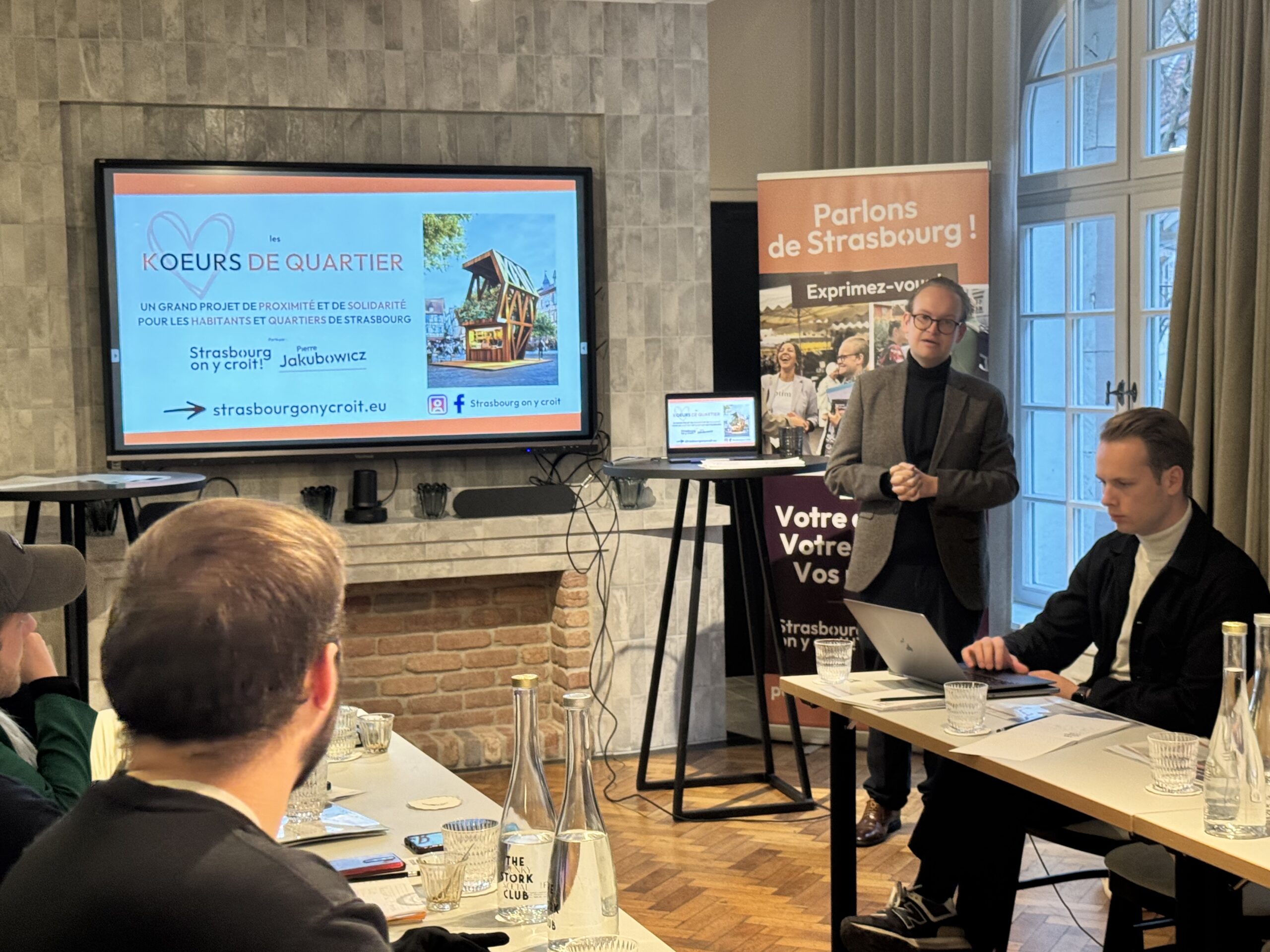 Avec Lionel Heiwy, responsable des projets urbains de “Strasbourg on y croit !” et Laure-Anne Brenckle, responsable du Pôle idées, et plusieurs Strasbourgeois engagés, nous avons donc travaillé à la construction des « Koeurs de quartier ». Afin de présenter aux Strasbourgeoises et Strasbourgeois notre projet pour la ville, nous avons tenu lundi 18 novembre une conférence de presse portant présentation des Koeurs de quartier :